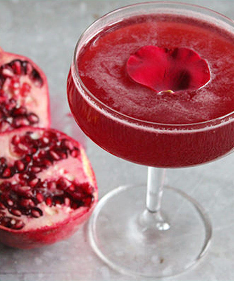 Vodka, lemon juice, pomegranate juice, agave nectar, a splash of rose water, and ice - shaken and strained into a champagne coupe, then garnished with a red rose petal - make for a fragrant and memorable dance on the palate. Both a creation of and a favorite of the lady of the house.