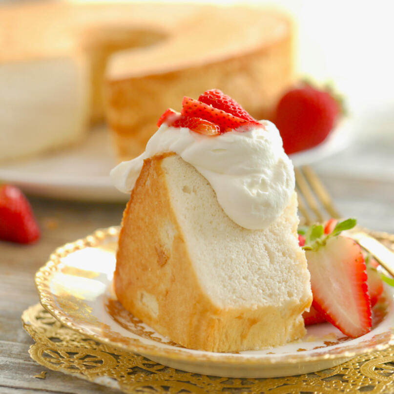 A light and fluffy sponge cake made from whipped egg whites, topped with a sugary whipped cream and sliced strawberries.