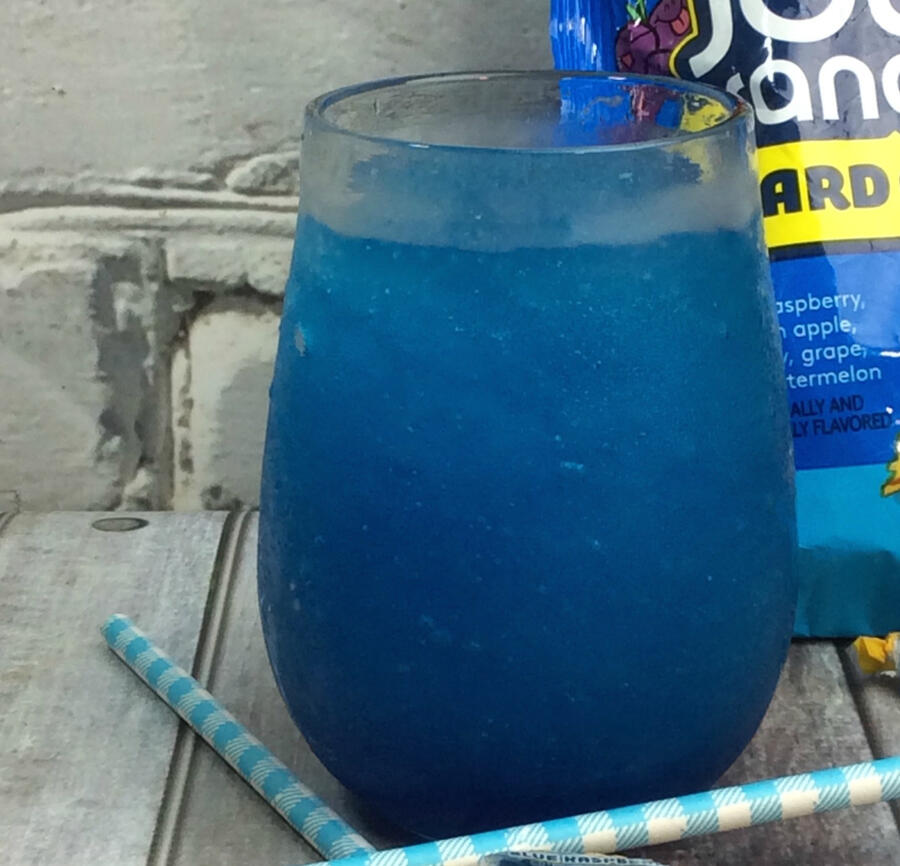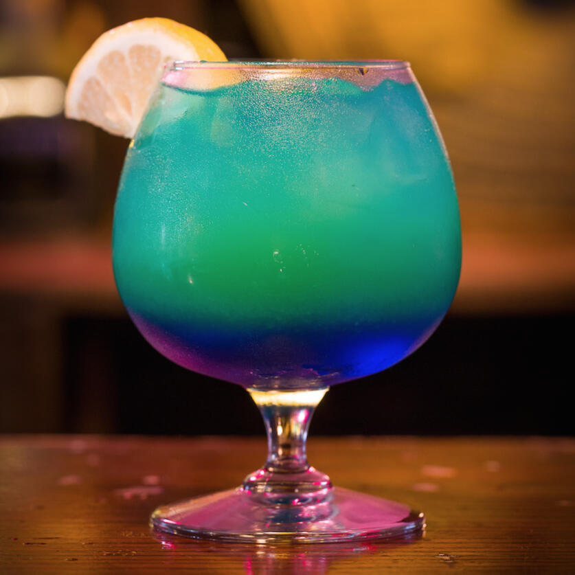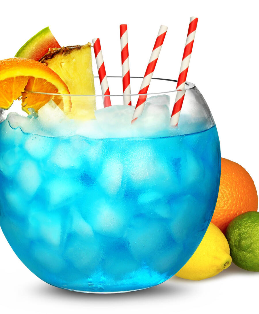 A shaken mixture of moscato, vodka, blue curaçao, pineapple juice, and lemon-lime tonic water. Includes 3 slices each of lemons, limes, and oranges, and two gummy fish, all poured into a fish bowl glass. The glass is then lined with crushed rock candy.