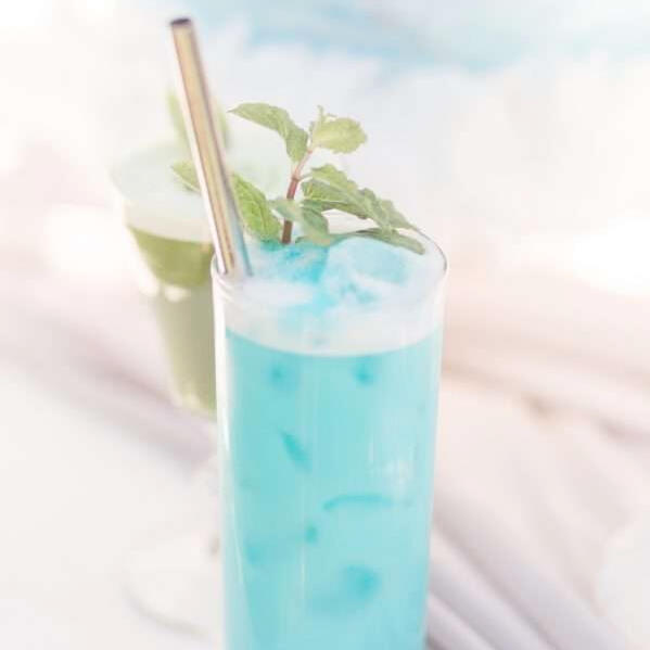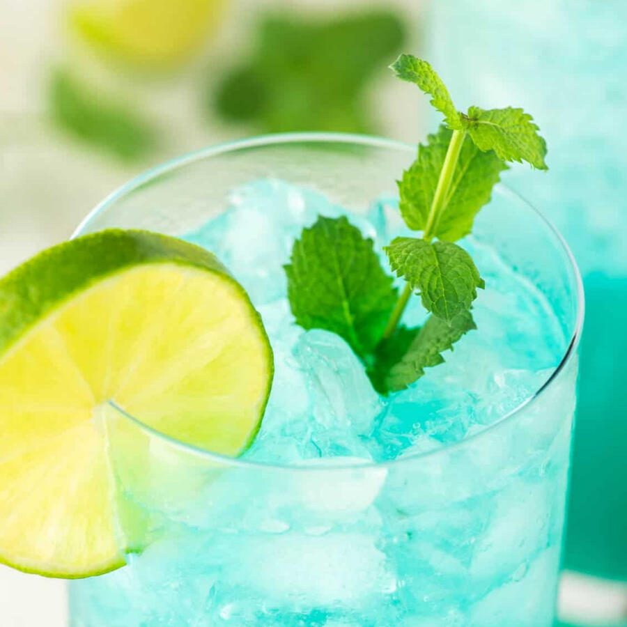 A tall glass of white rum with a dash of lime, soda water, and a shot of blue curacao topped off with a sprig of mint.May it bring you memories of your friends, new and old.