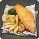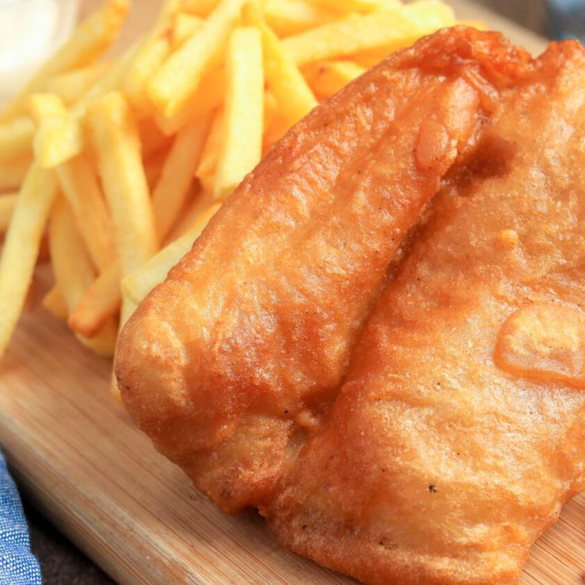 Freshly caught, beer-battered fish with a side of thinly cut popotoes.Don’t eat them when Mitron is looking.