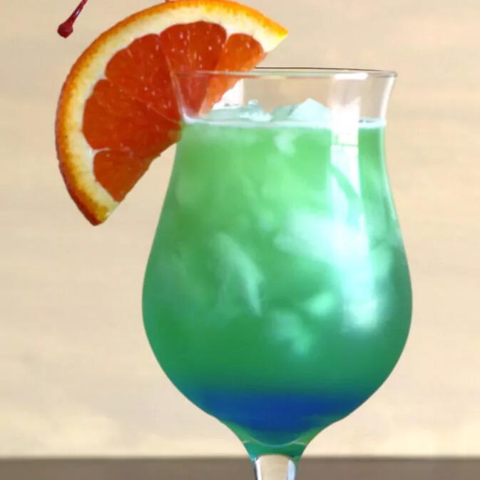 A Citrusy and Fruity drink with Lime juice, Soda water, and Green Apple Smirnoff, and a shot of Blue Curaco. Slice of Blood Orange on the glass with a Cherry for style.May or may not make you want to oversoul.